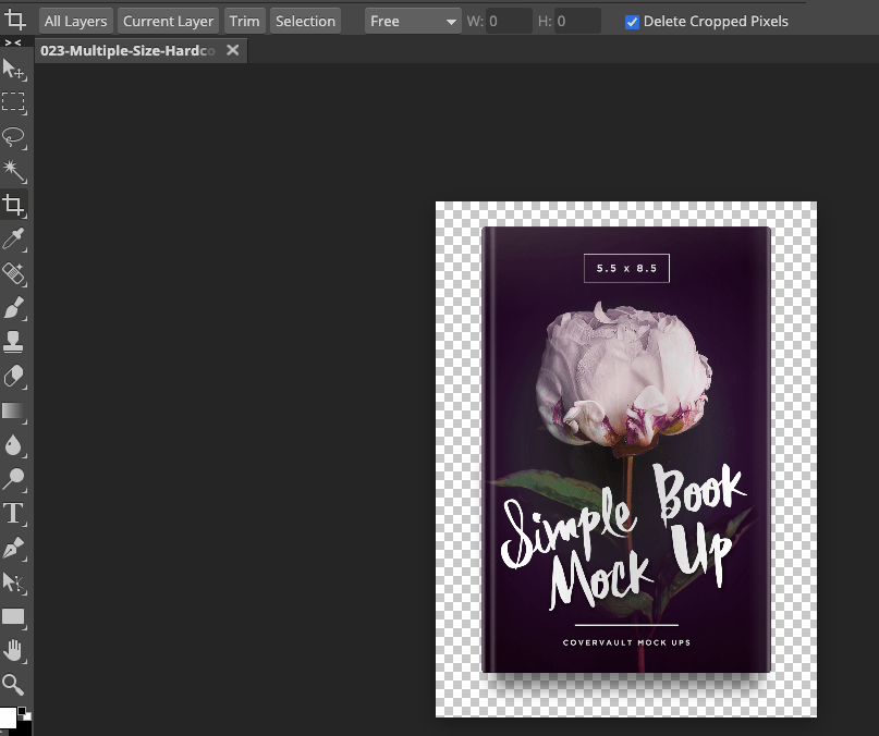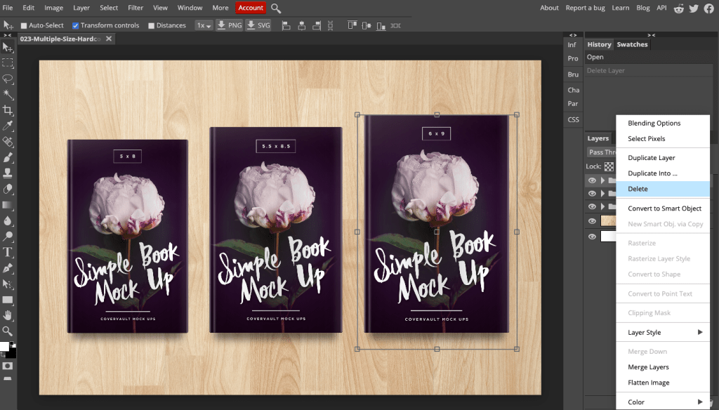 Photopea is essentially a free, web-based version of Photoshop. How is that possible, you ask? I don’t know, but I’m loving it! And you don’t have to learn all the ins and outs of Photopea to make a simple 3D cover mockup. Here are the basic steps for modifying Covervault templates in Photopea. For this example, I’m using the Covervault template found here: https://covervault.com/multiple-size-hardcover-books-psd-mockup/.