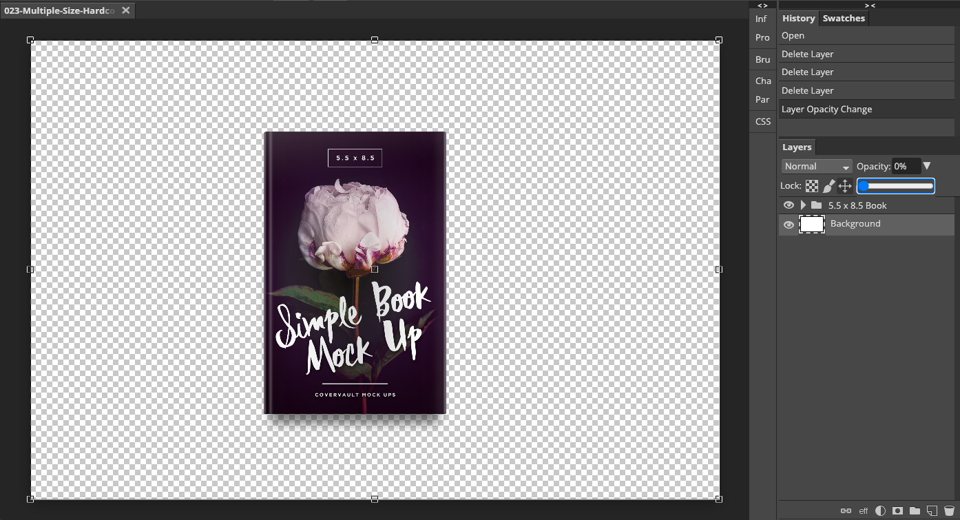4. Delete the background if you want to create a transparent cover image that you can use for making a variety of promotional graphics. To do this, select and delete the layer named “Wood Floor.” Now select the “Background” layer and drag the opacity to 0.