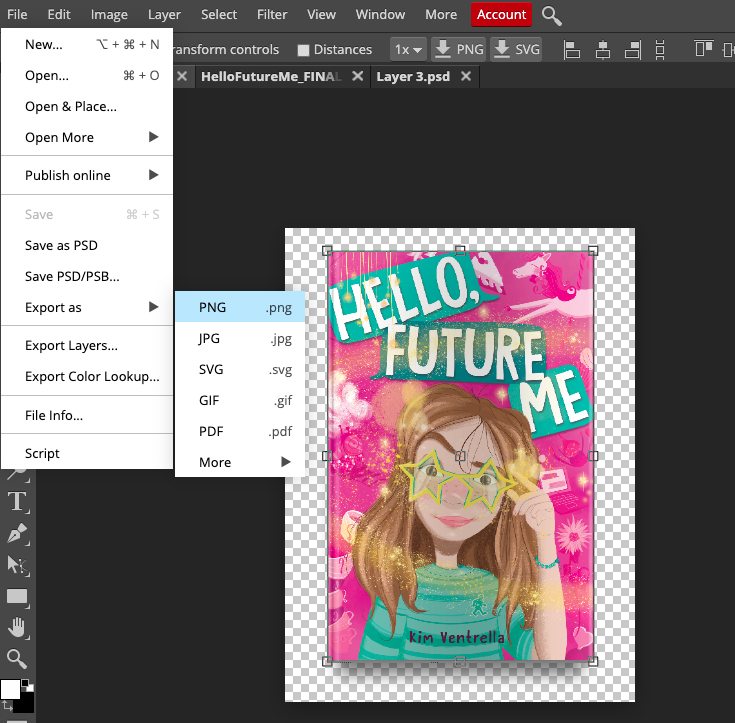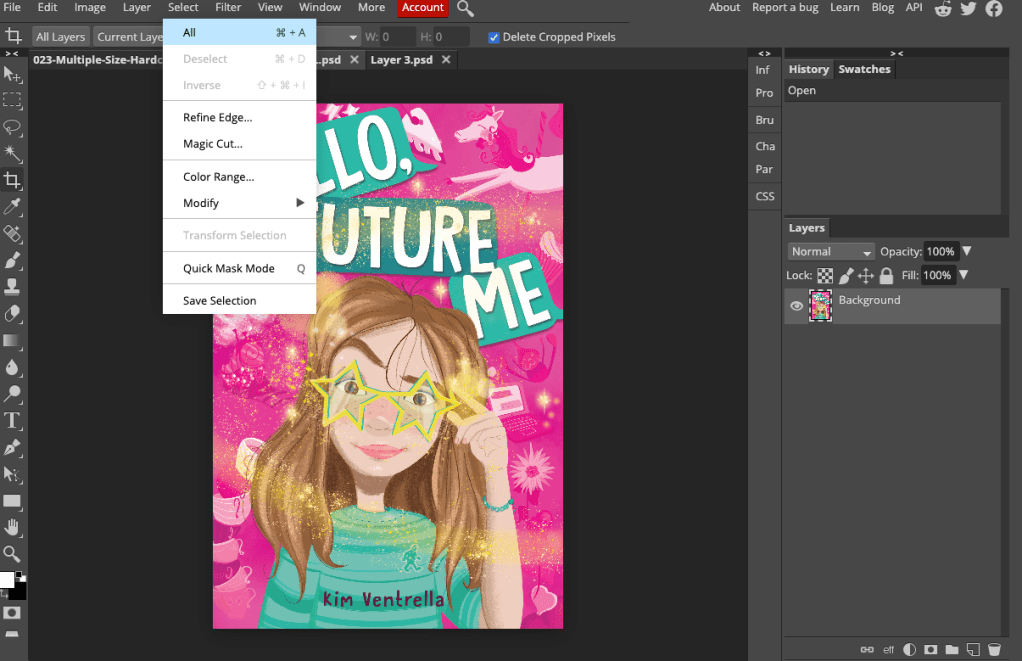 8. This should have opened a new tab. For me, it’s called “Layer 3.” Next step is to navigate back to the tab with your cover. On the top navigation bar, click “Select” then “Select All.” Next, go to “Edit” and then “Copy.” Yes, you have to manually click to select and copy stuff in this scenario. If you try using keyboard shortcuts, the process won’t work.