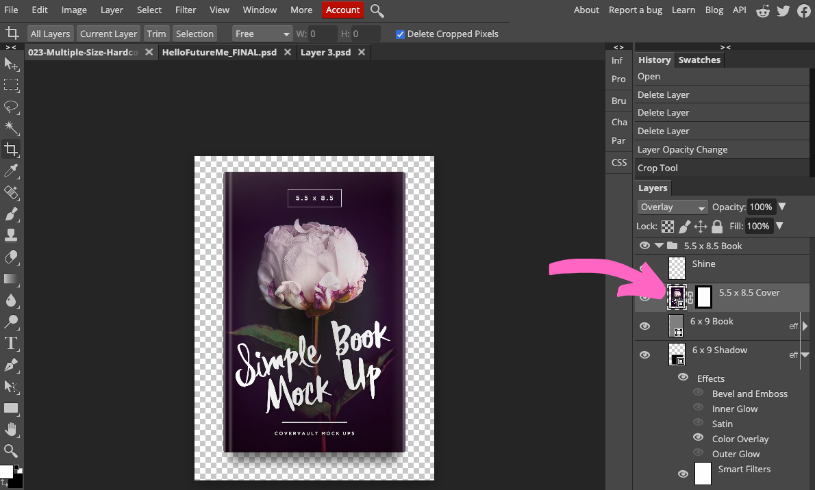 7. Next, go back to the tab with your Covervault template. You’ll see a layer for the cover size you’ve chosen. For me, it’s the 5.5 x 8.5 cover. Click the arrow on the layer to expand it. Find the Smart Object. This looks like a mini version of the sample cover linked to a blank rectangle. Double click the Smart Object to open it in a new tab.